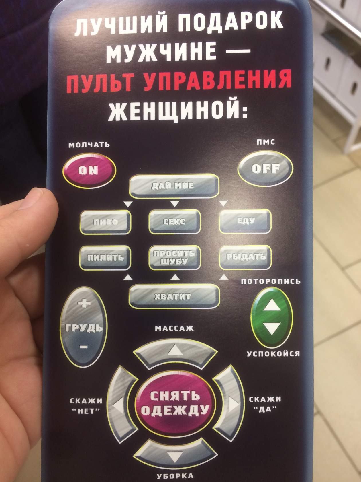 Да, дамы, прогресс дошел и до такого. Теперь любимому мужчине можно подарить «Пульт управления женщиной». Если у него все в порядке с чувством юмора, то этот подарок как раз для него. Как правило, это бутафорский прибор, который имеет массу клавиш якобы для переключения женских функций: