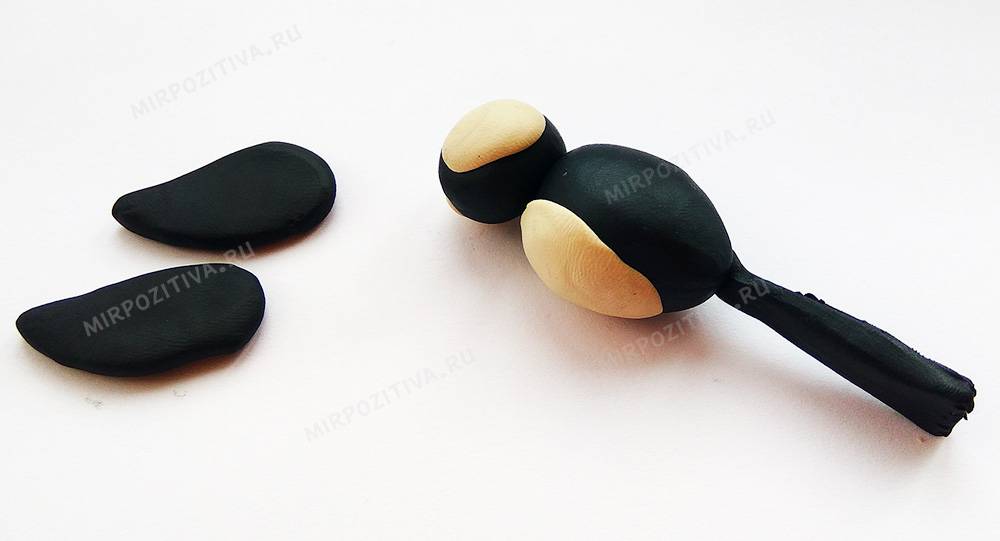 Шаг 5. Из дополнительных кусочков черного пластилина вылепите крылья. Форму их уже рассмотрели на примере лепки вороны. Приклейте такой же длинный хвост.