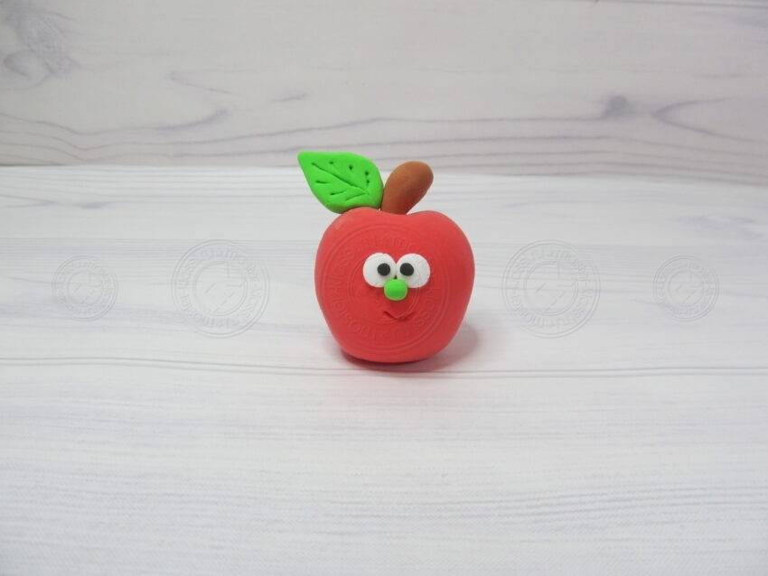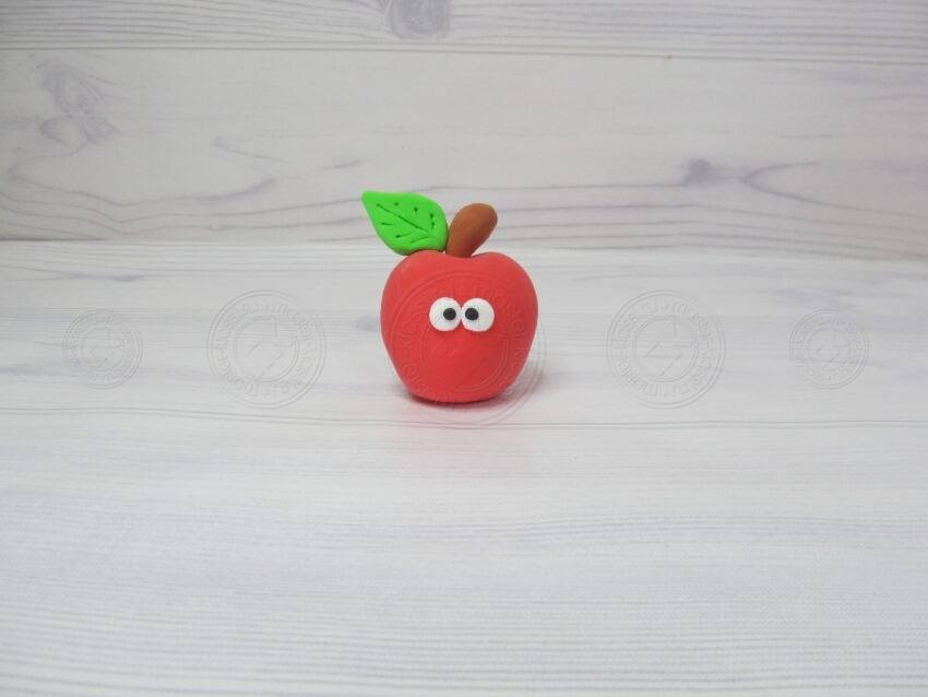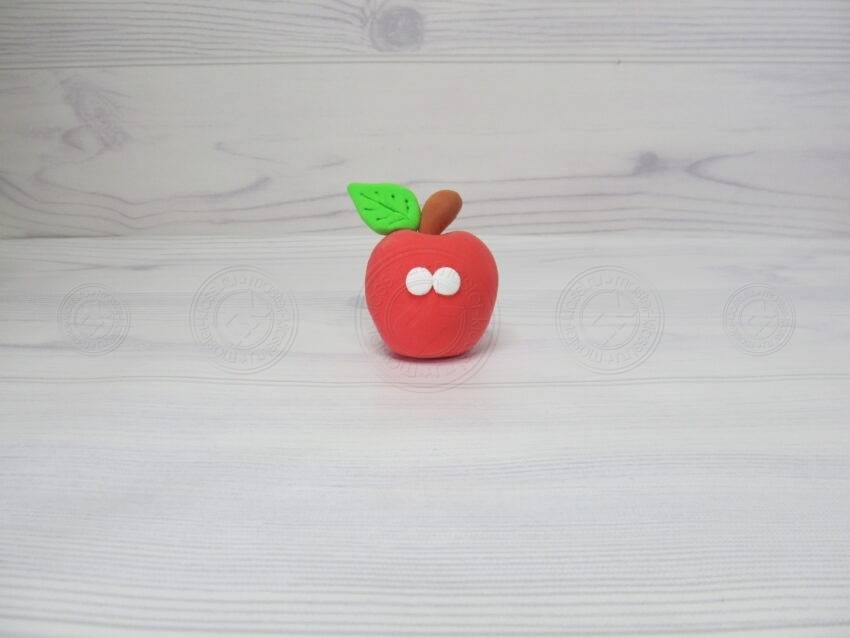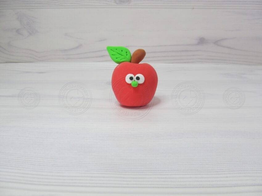 13. Салатовый пластилин нам необходим, чтобы скатать маленький шарик и сделать из него нос, закрепив на яблоке ниже глаз. Сделать форму можно даже на ладони при помощи одного пальца.