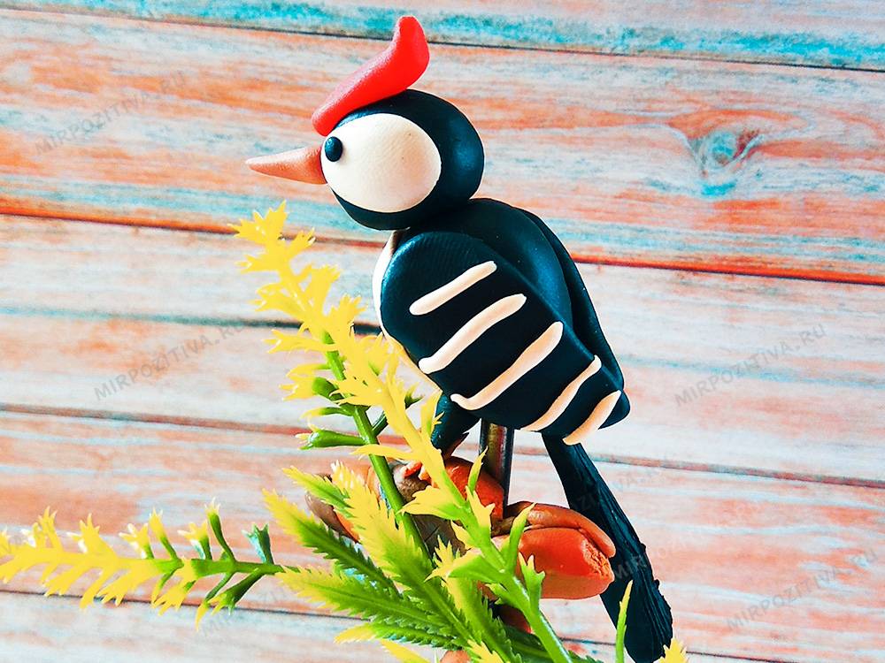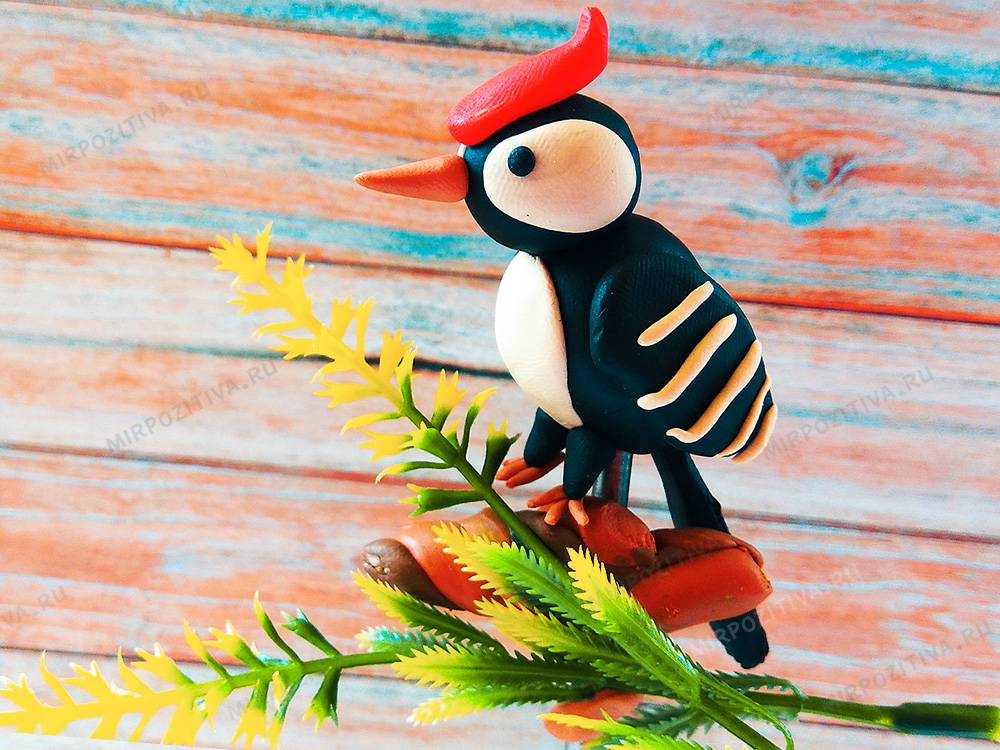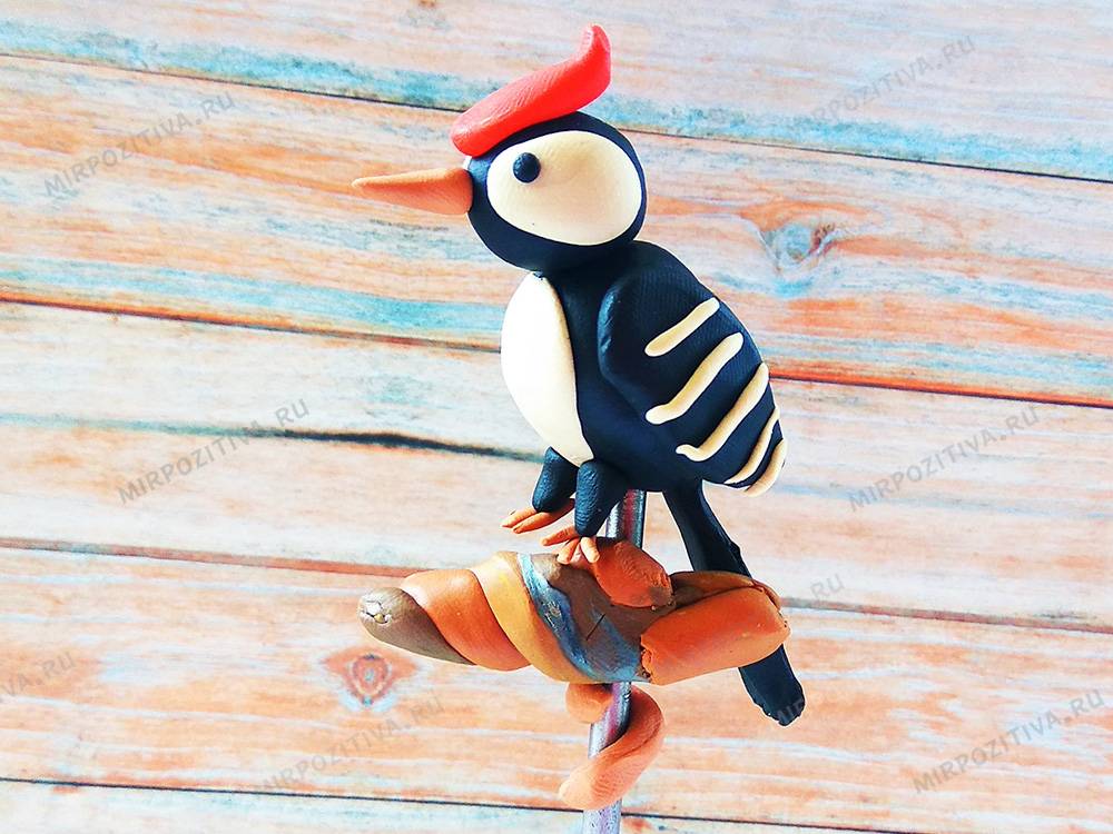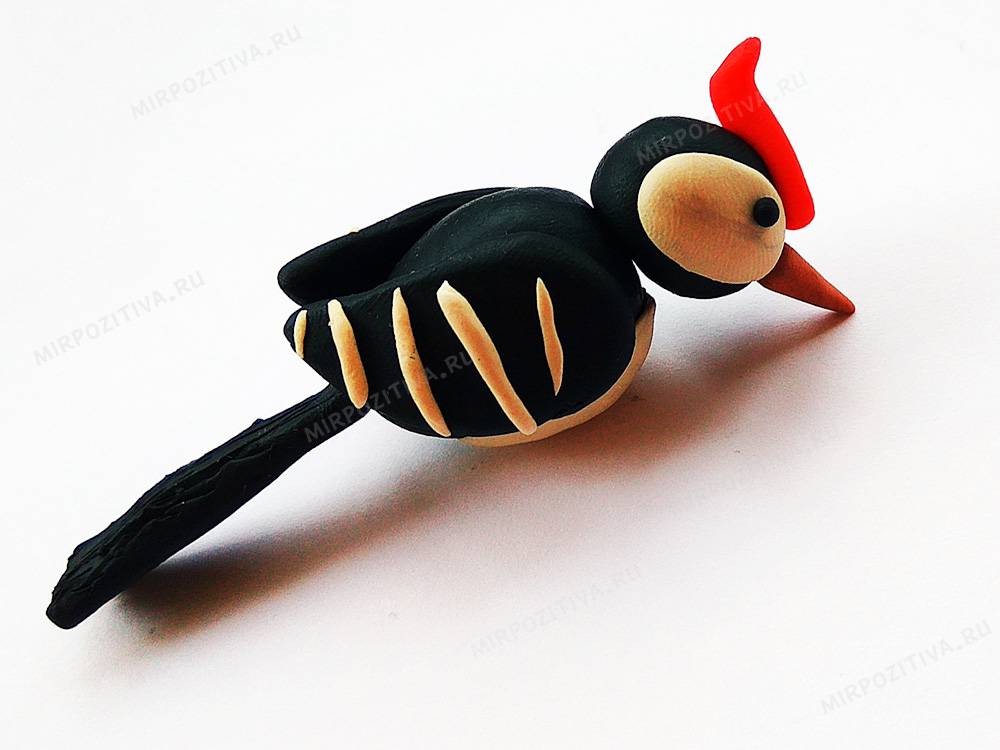 Следующий мастер-класс будет по лепке дятла из пластилина. Помните, что окрас этих птиц черно-белый с пестрыми вкраплениями красного или желтого. Поэтому подготовьте соответствующие цвета обычного пластилина или воздушного.