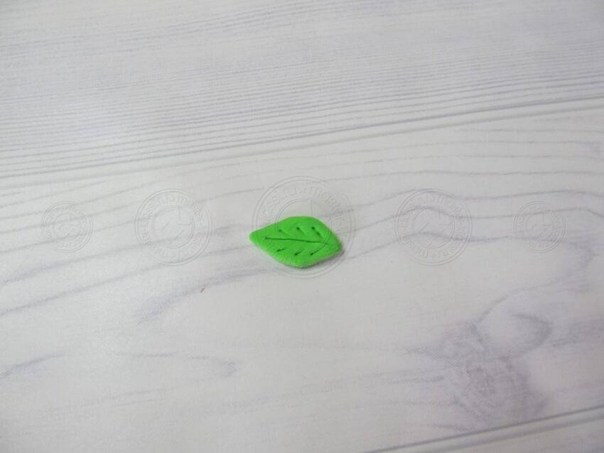 - Когда изготовление бутона завершено, из тонких зеленых колбасок и каплеобразных расплющенных деталей собираются листья растения.