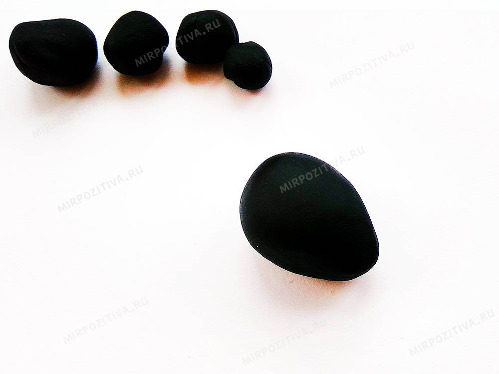Шаг 2. Поделите черный брусок так, чтобы слепить туловище, крылья, голову и хвост.