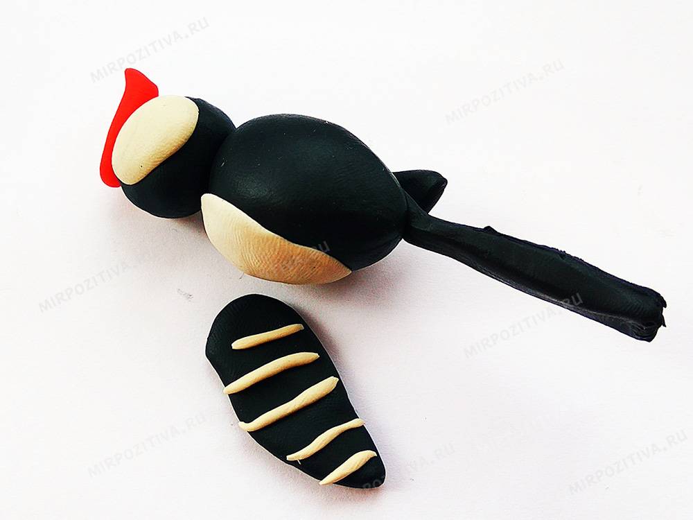 Шаг 6. На крылья наклейте тонкие белые полоски поперек. Сделайте это на первом и на втором крыле. Также небольшую красную пластилиновую колбаску прикрепите на голову в виде хохолка. С обратной стороны поднимите вверх своеобразный гребешок, он должен быть у дятла.