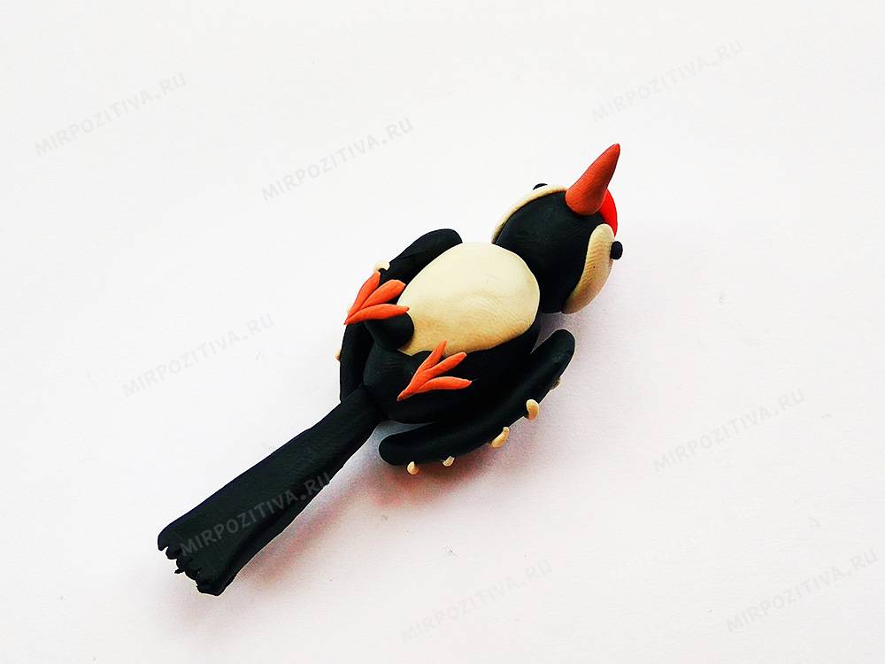 Шаг 8. Приклейте ноги такой же формы, как и в случае лепки вороны. Только сами лапки можно выполнить из оранжевого пластилина.