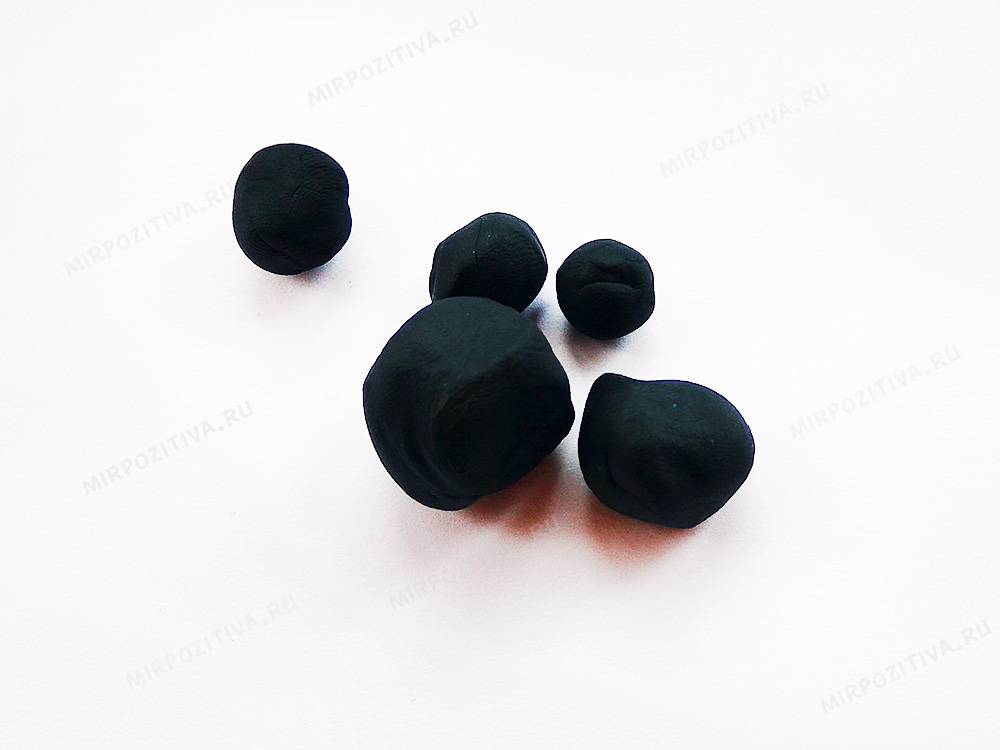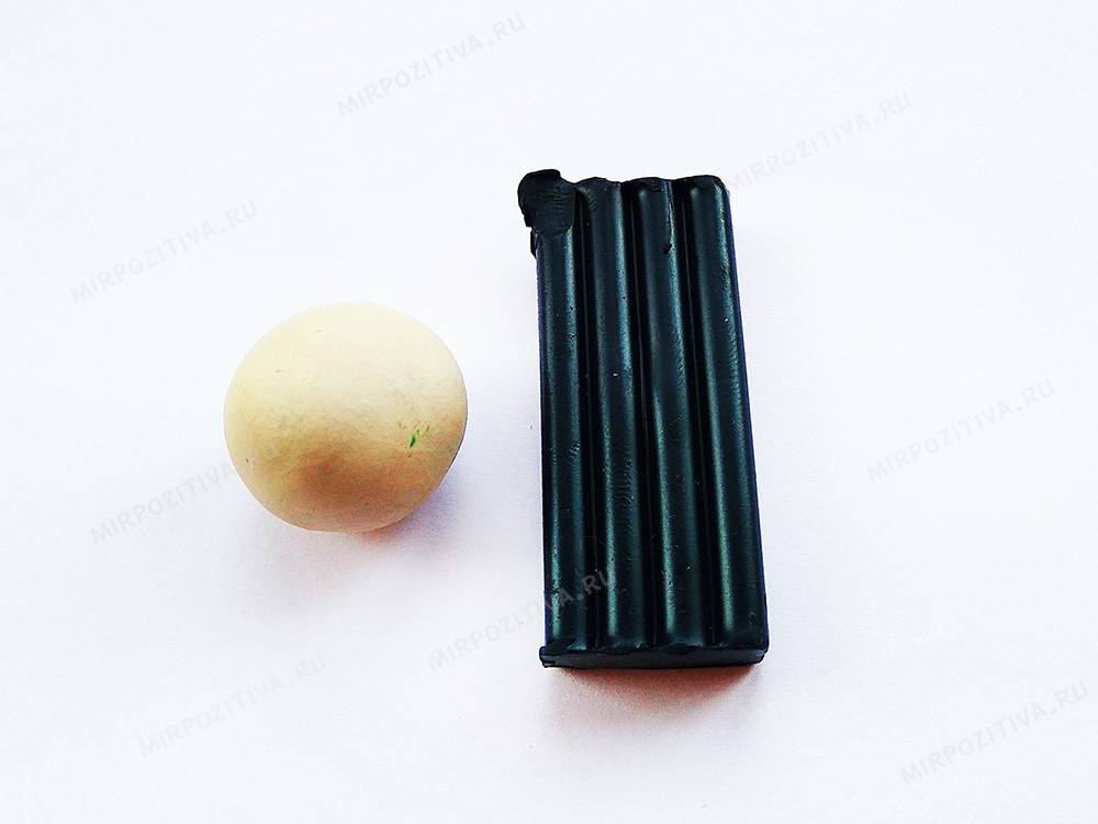 Шаг 1. Как и в предыдущем случае, основным бруском пластилина станет черный. Но в этом случае нужно добавить белые фрагменты на оперение. Еще будет необходим маленький кусочек красного и коричневого или оранжевого для клюва и хохолка.