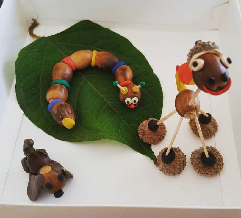 Когда ребенок уже подрос и освоил навыки работы с ножницами или иголкой, то поделки могут приобретать уже более сложные формы, становиться объёмными. Ягодки, с помощью нитки с иголкой, могут превращаться в бусы. А несколько жёлудей, при помощи пластилина и спичек, приобретать вид человечка. Такое времяпрепровождение отлично подойдет для внеклассных занятий в школе или для совместного проведения досуга с родителями за пределами учебного заведения.