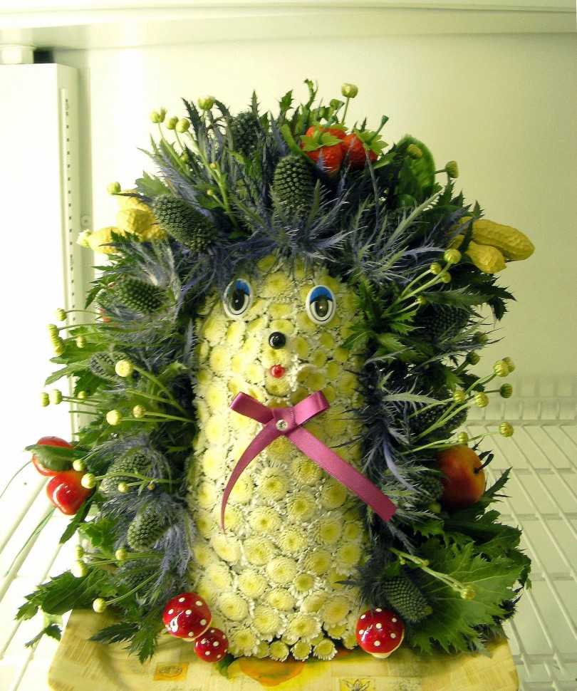 Глаза и нос сделать из бутонов пряности гвоздика или приклеить готовые, бегающие, глазки. На шею подвязать ленточку и завязать бантик. А на иголки положить слепленные из пластилина грибы и ягоды.