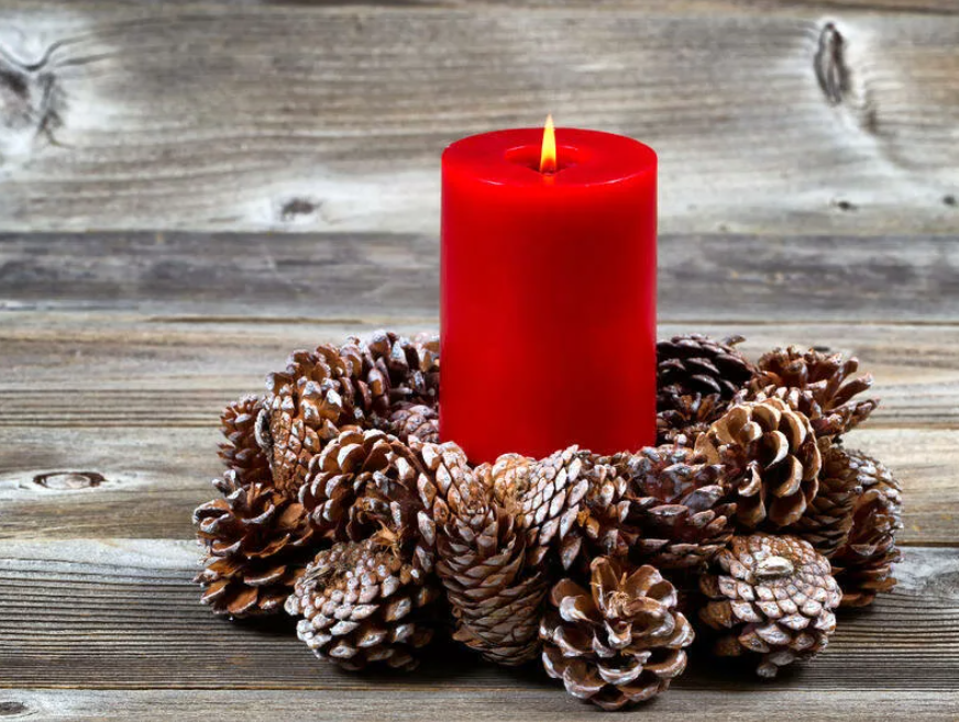 Особую атмосферу уюта в праздничный вечер создают свечи в тематическом подсвечнике. Его несложно смастерить из шишек, картонной основы, спрей-краска и клей.
