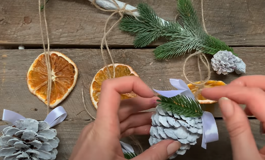 Для завязки используем бечевку, которую приклеиваем к шишке вместе с еловыми искусственными веточками и елочными маленькими шариками разных цветов.