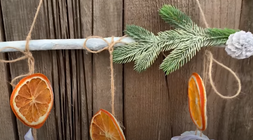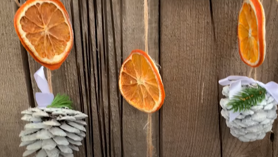 На концах веревки сделать петли или оставить концы свободными для закрепления поделки на стене. Сделать разметку на веревке, обозначив места прикрепления шишек. Остается только приклеить декорированные шишки на веревку.