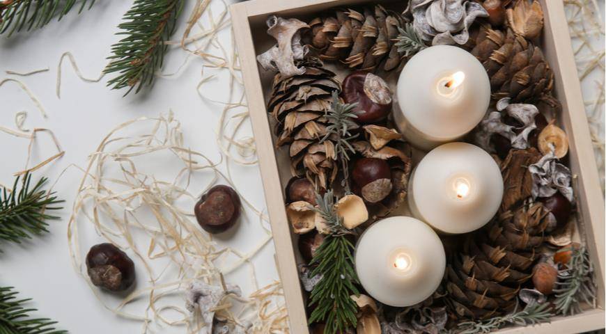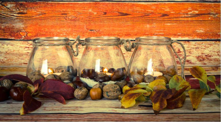 Можно сделать оригинальную композицию, используя желуди, орешки, каштаны и свечи. На широкой тарелке разместите орешки и каштаны.