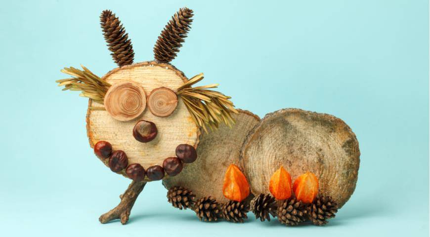 Различных фигурок из каштанов можно склеить огромное множество. Один из самых доступных детям вариантов — веселая гусеничка, которая добирается по дорожке из осенних листочков домой. Придумайте о ней интересную историю, и дети будут просто в восторге от своей новой поделки!