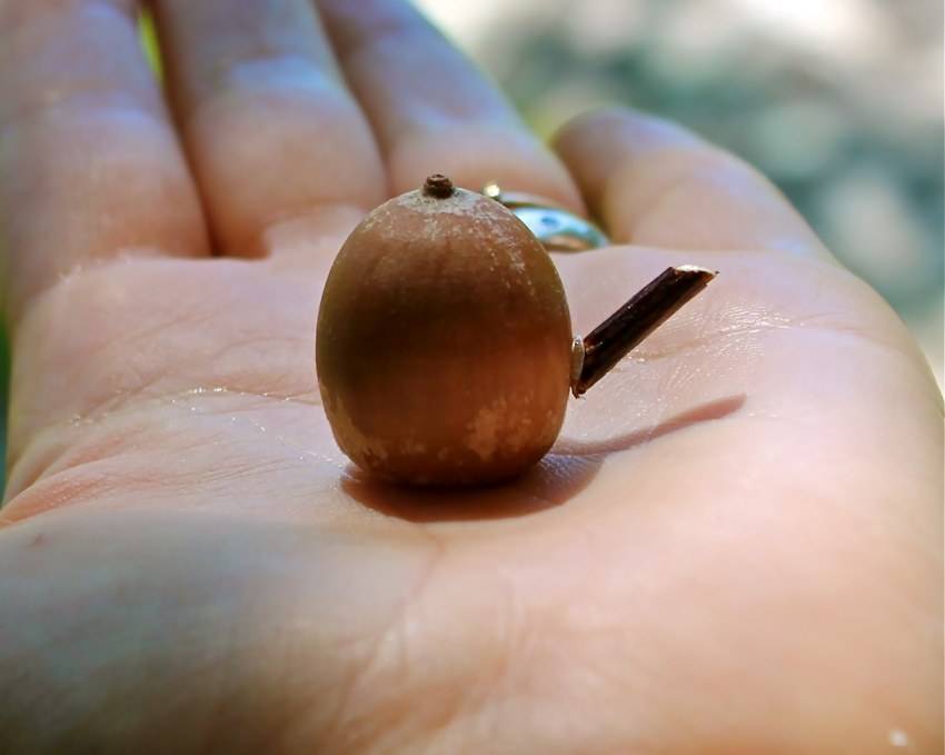 - жёлуди со шляпками и короткими веточками, на которых они росли (плоды нужно подбирать как можно мельче, круглее и светлее);