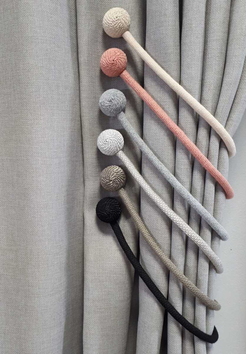 - магнитные подхваты будут хорошим выбором для лёгких занавесок, например, тюлевых, кружевных, сшитых из органзы, а материалом для них самих может послужить кружево, тесьма, шнуры, ленты, бисер и бусины и т. п.;