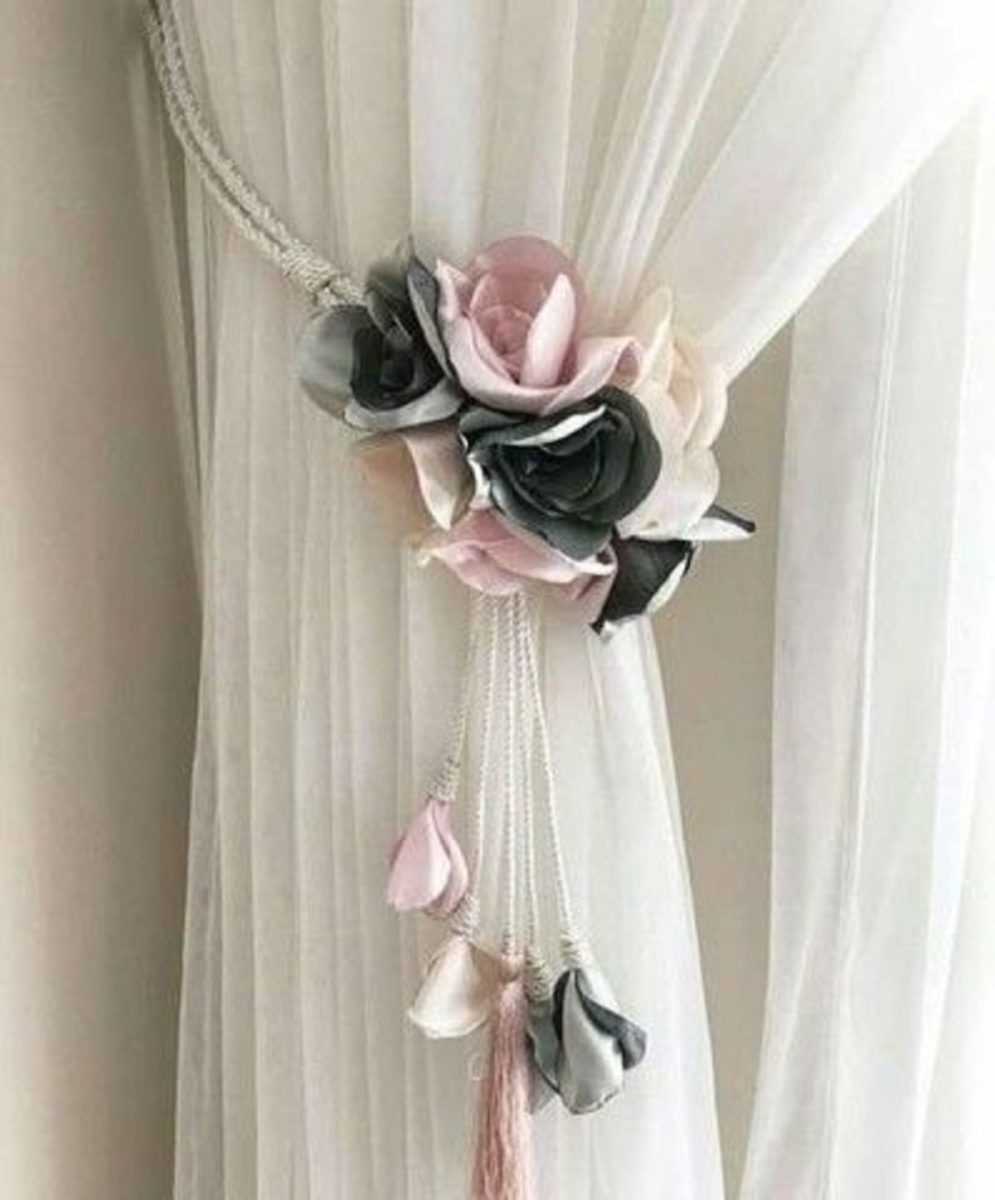 В качестве основы можно использовать классические держатели или подхваты для штор, изготовленные своими руками из атласной ткани, как показано в предыдущем примере. О том, как сделать розы, указано ниже: