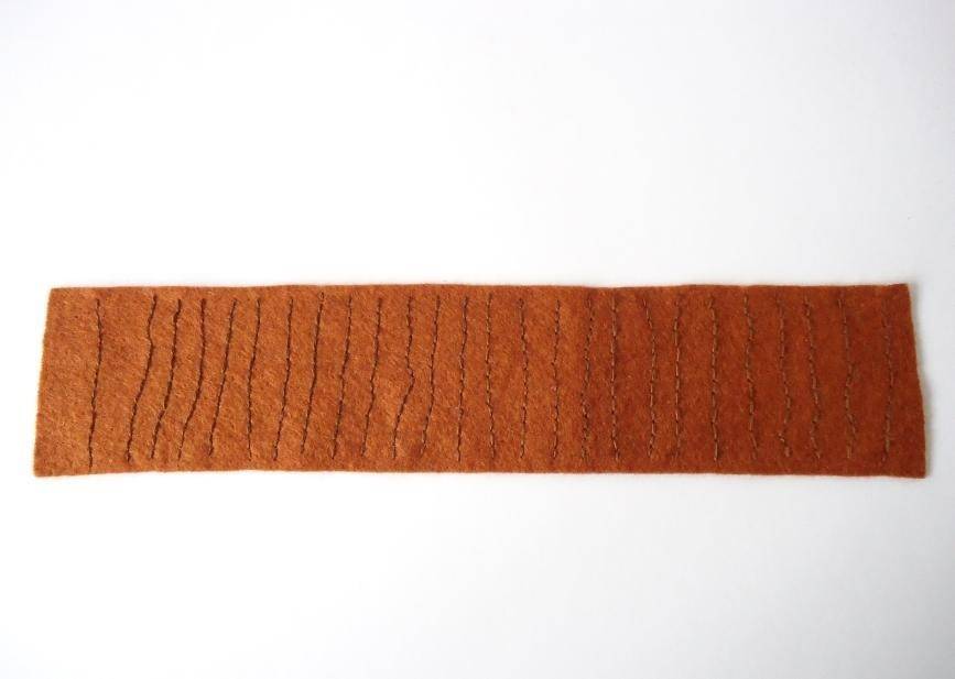 Прошиваем или прострачиваем вертикальные полосочки на отрезе коричневого фетра – они будут имитировать трещинки коры нашего пенёчка. Используем нить темно-коричневого цвета.