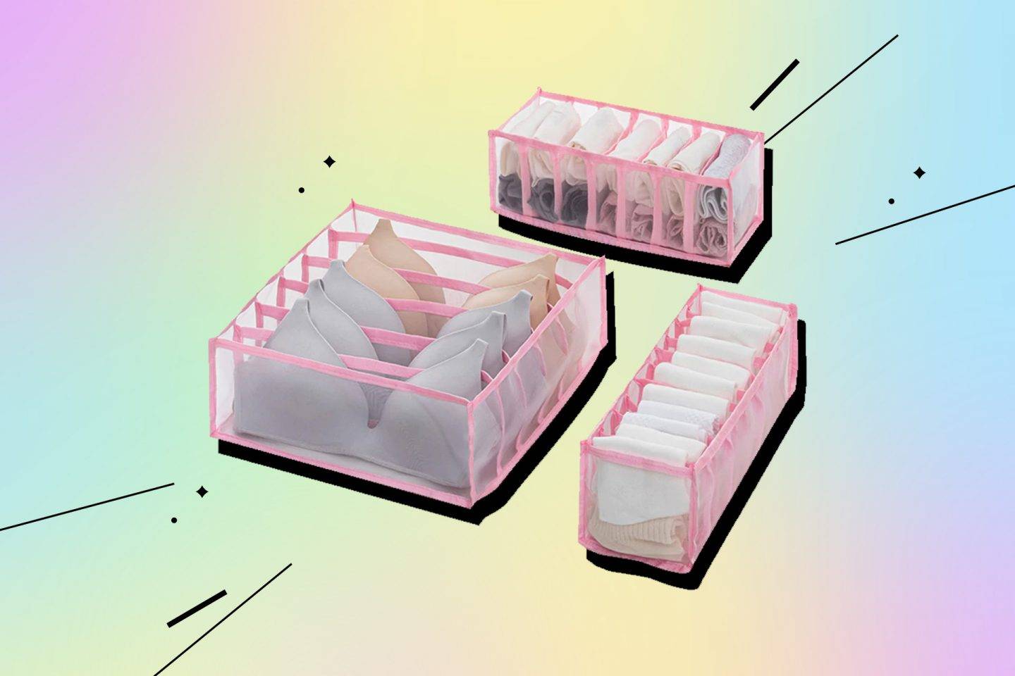 Нейлоновые коробочки со специальными отделениями укладывают в ящик для хранения нижнего белья. Вещи нужно свернуть в рулон (как советует Мари Кондо) и разложить по секциям. Так вы достанете нужные трусы или носки, не нарушив общий порядок. В наличии органайзеры разных размеров, можно купить только один или заказать целый набор.