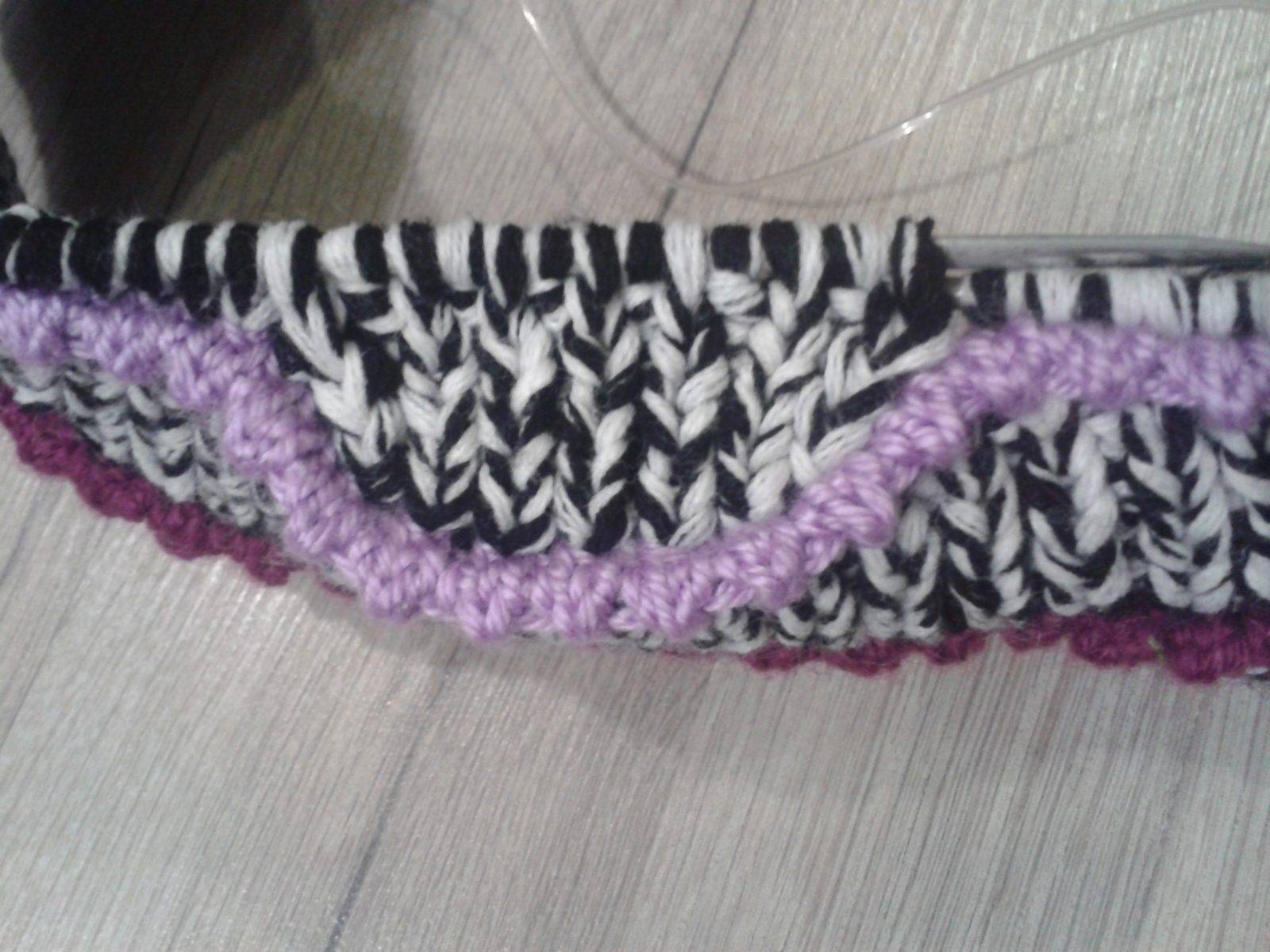 Вязание продолжила на поднятых петлях по кругу лицевыми петлями ( без нити «Ирис»), но дойдя до петли выделенной маркером, вязала 2 петли вместе до маркера, затем 1 лицевую с маркером, и 2 вместе после маркера. И так всегда по кругу до петли с маркером 2 вместе и после петли с маркером 2 вместе. После набора со всех сторон подошвы я вязала 3 р. черной пряжей лицевыми петлями, затем 2 р. зеленой пряжей, опять 3 р. черной пряжей. 9 р.: 2 лиц. черной пряжей, 2 лиц. зеленой пряжей. 10 р. как 9-ый р. 11,12,и 13 р. вязала черной пряжей лицевыми петлями. Затем 2 р. зеленой пряжей, 8 р. черной пряжей и р. черной пряжей резинкой 1 х 1. Закрыть петли. Не забывайте убавлять петли в каждом р. ( как я описывала выше). Рисунок можно вязать любой.