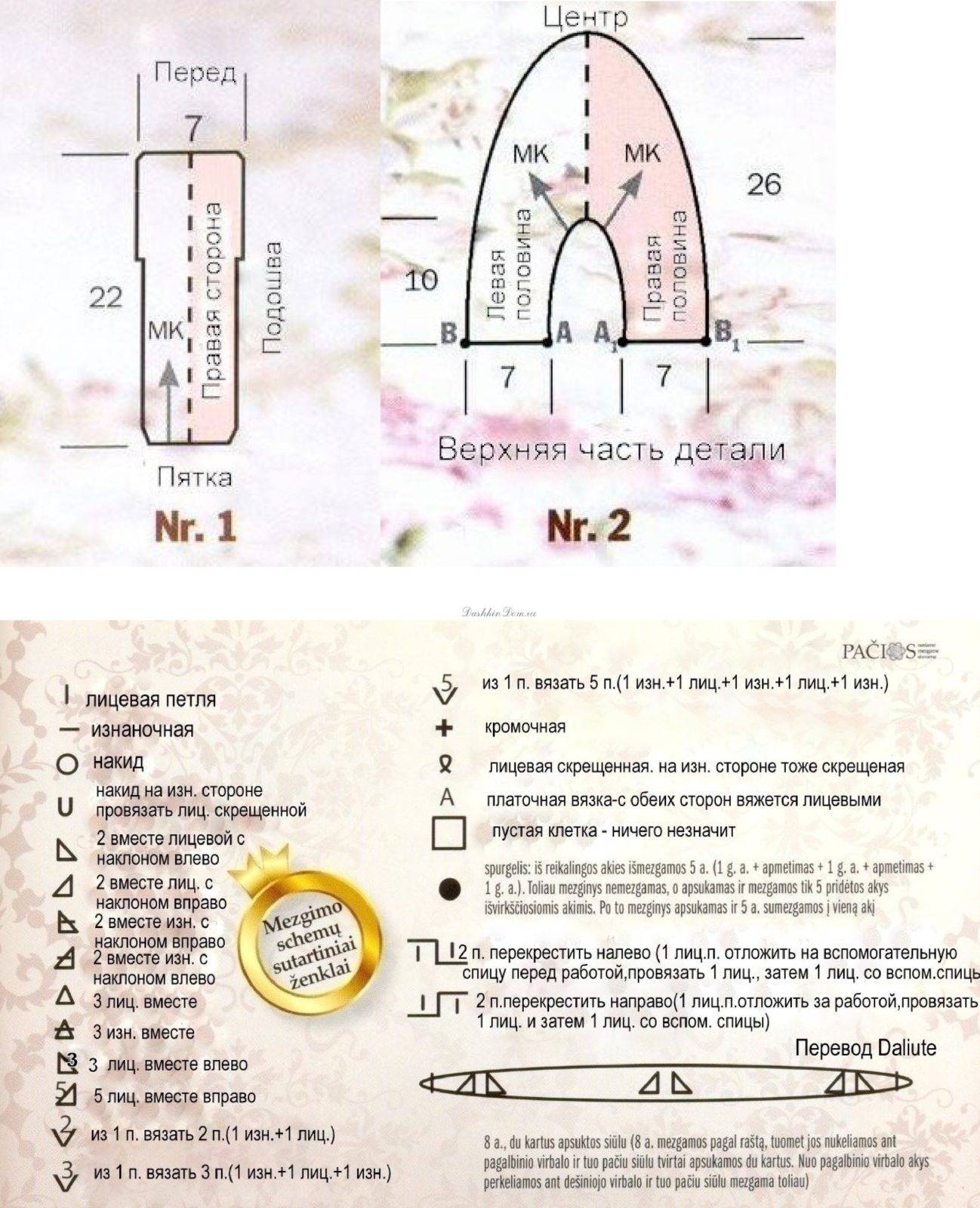 Первая схема, которую мы вам продемонстрируем, состоит из двух частей (подошвы и верха следков). В описании поданы все нюансы работы со спицами и с крючком, который также понадобится при создании данного изделия.