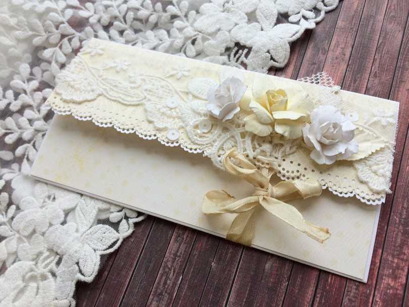 Максимально простой в изготовлении вариант открытки. Как следует из названия, центральным местом такой пригласительной открытки является кружево, которое приковывает на себе взгляды.