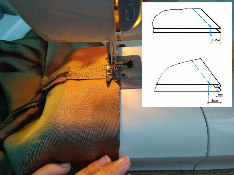 Это более сложная по пошиву деталь. Лицевой частью внутрь сложить две детали. С трех сторон нужно подвернуть обе части два раза. Зашить запошивочным швом. Если есть кромка, она не требует определенной обработки, эти края можно стачать обычным способом.
