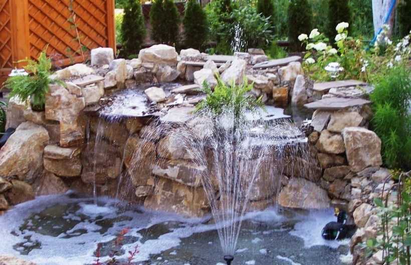 В итоге должен получится маленький гейзер: вода из помпы, расположенной на дне пруда, будет качаться по шлангу, затем выходить наружу и через дренаж фильтроваться, а далее по каскадам стекать обратно в пруд.