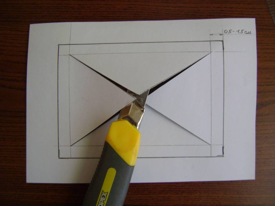 3.Делаем прорезь в центре и доводим разрезы до углов прямоугольника по диагонали.
