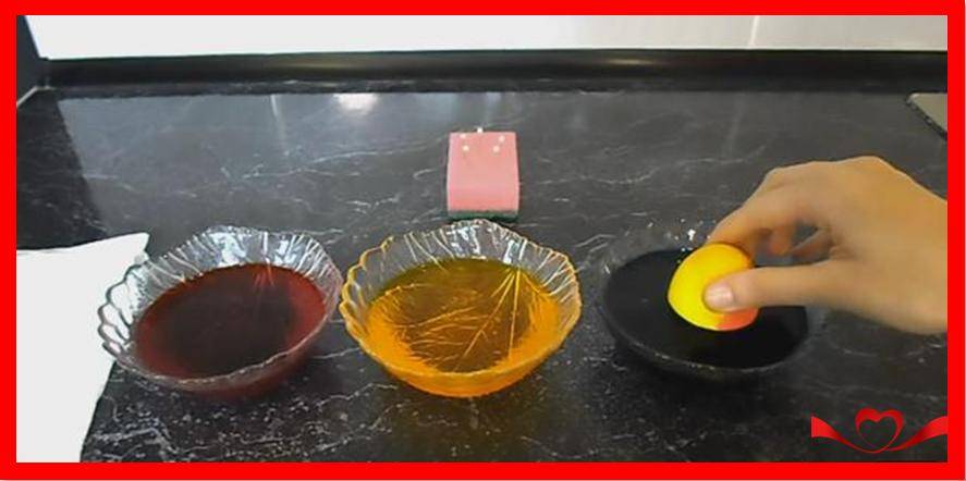 3. Опустите не полностью яичко в краску, чуть-чуть подержите в красителе 2-3 минуты. Уберите яйцо и каплю краски уберите салфеткой.
