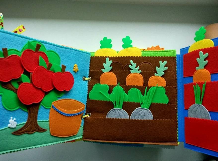 - Чтобы ребенок мог развивать мелкую моторику, мышление, придумайте задания для него. Так, на страницах могут быть элементы, которые присоединяются к основе при помощи липучек или пуговиц. Например, овощи, которые нужно «посадить» на грядку, яблоки и грибы, их ребёнок прикрепит к ежику. Сняв элемент с кнопками, дитятко увидит за ним что-то интересное. Расстегнув молнию, малыш раскроет крылья божьей коровки.