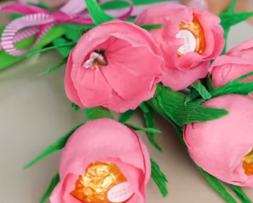Нежно розового цвета розочки со спрятанными внутри конфетами приведут в восторг даже взрослую женщину, не говоря уже о девушке. Чтобы порадовать таким необычным подарком свою избранницу, потребуется приложить немного усилий.
