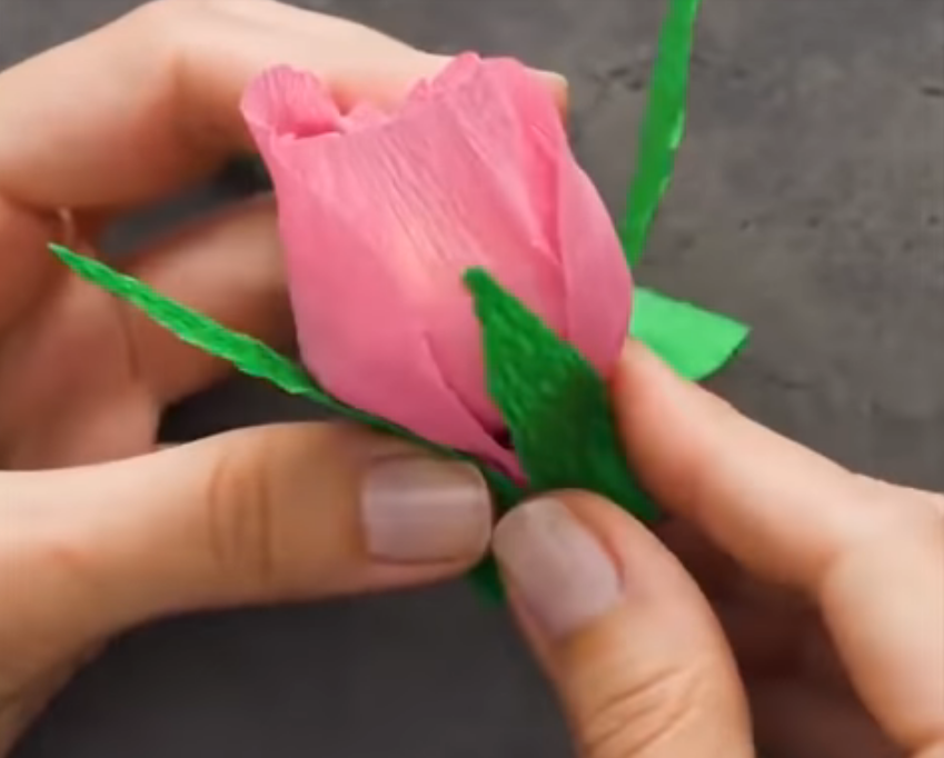 - Чашелистики приклейте у основания розы. Фиксацию обеспечит клеевой пистолет. Лишнюю бумагу срежьте.