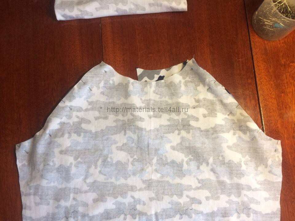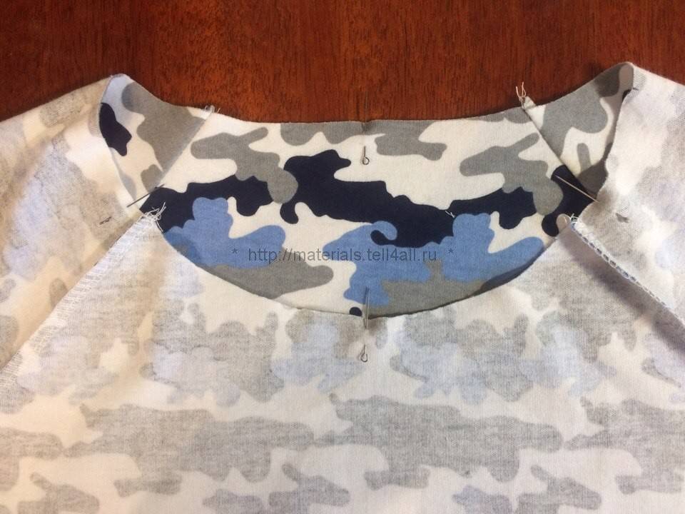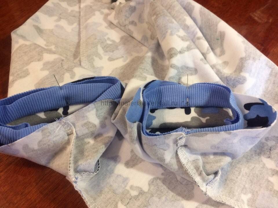 Скалываем булавками. При этом припуски рукавов подворачиваем на сторону спинки. Припуски на резинке советуем развернуть в разные стороны, чтобы получить минимальную толщину материала в этом месте.