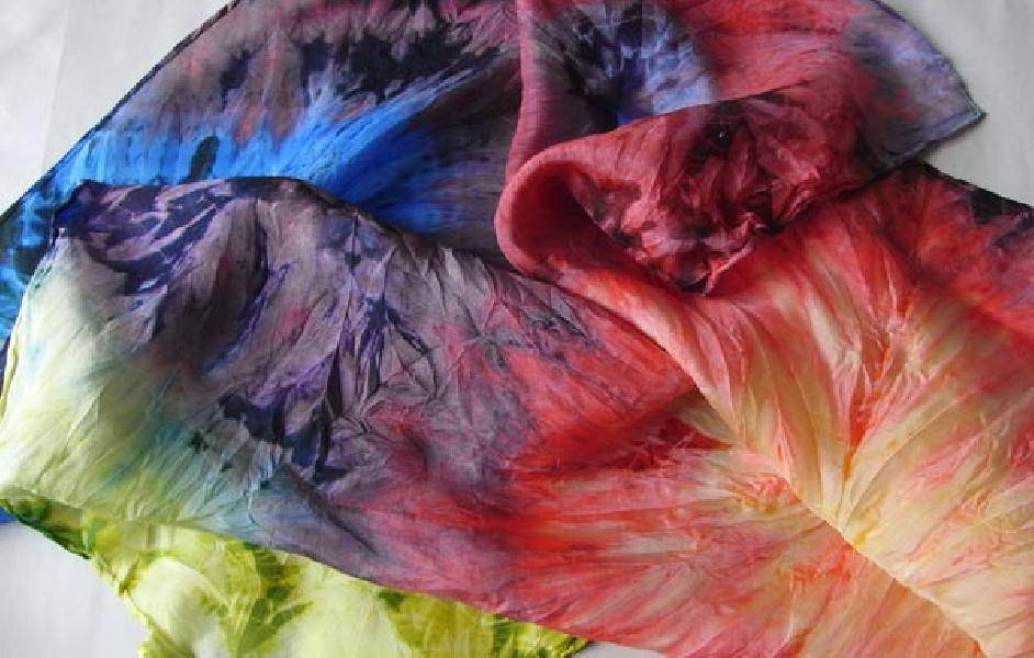 Этот вариант сильно разнится с предыдущими. Это уже не столько роспись, сколько скорее окрашивание ткани. Полотно складывают различными способами, перевязывают или сшивают ниткой и затем окрашивается краской.