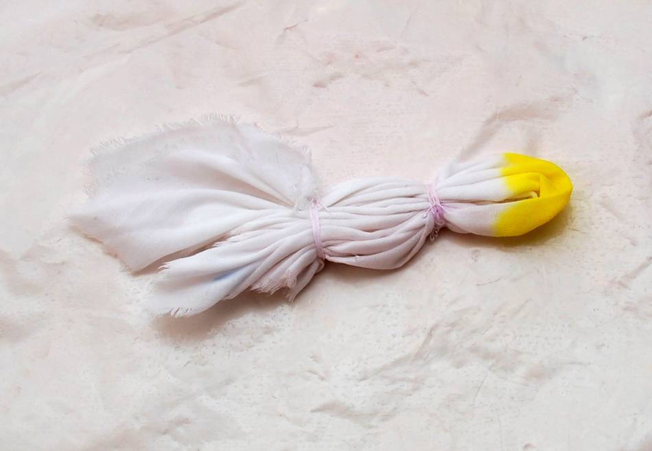 . После того, как материя прокрасится, сполосните ее под проточной водой. Первый раз вместе с узелками, затем развяжите их.