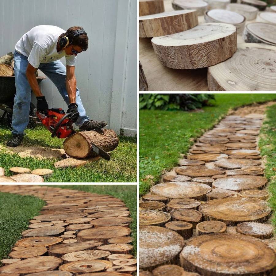 На дачных участках популярны поделки из спилов дерева. Это может быть стена беседки, часть забора, садовые скульптуры. А еще это подходящий материал для садовой дорожки.