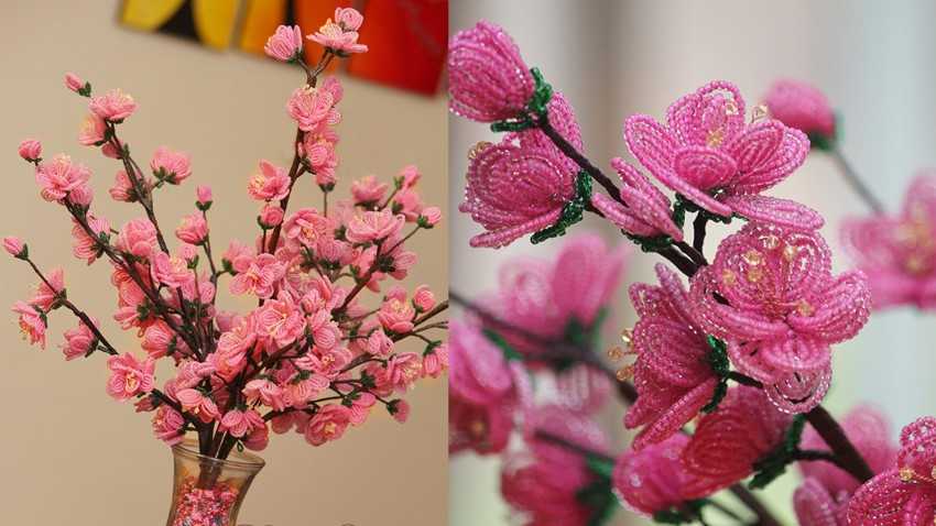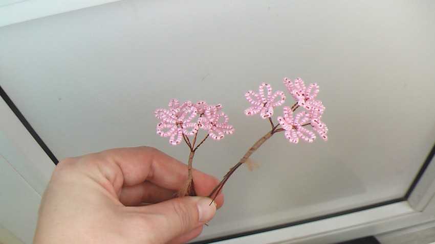 Таким образом одеваем пять цветочком, по два цветочка вместе. Вот такие веточки для изготовления сакуры у нас получаются.
