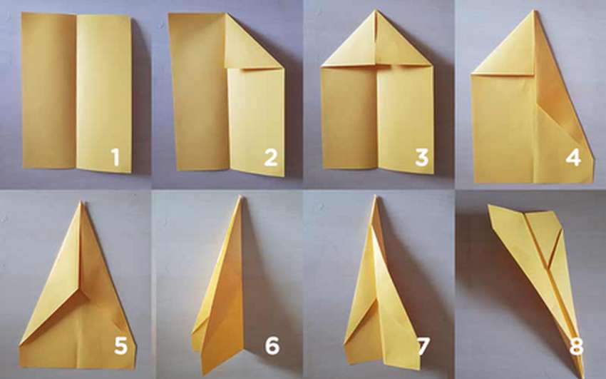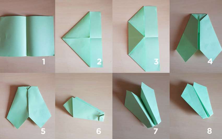Думаю, всем известно, что техника складывания различных фигурок из бумаги называется «оригами». Яркий ее пример – это как раз изготовление бумажных самолетиков. Поскольку схем очень много, я не буду расписывать каждый шаг. Вместо этого предлагаю посмотреть на вот такие очень понятные и подробные картинки, рассказывающие, как шаг за шагом создать летающий самолетик своими руками.