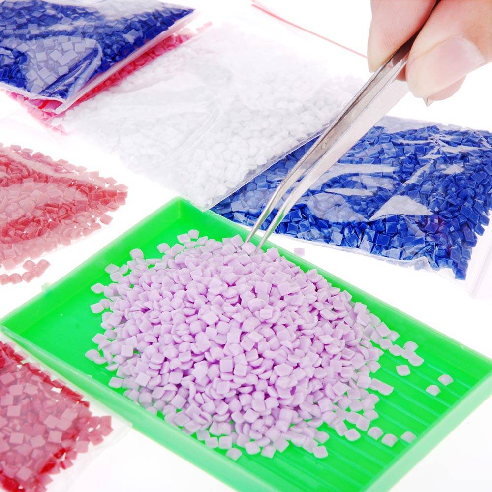 - блюдца для работы с алмазами нужного цвета. В блюдце высыпается пакетик страз с одним цветом, затем пинцетом стразы по одному подхватываются и укладываются на клеевой слой схемы, узора.