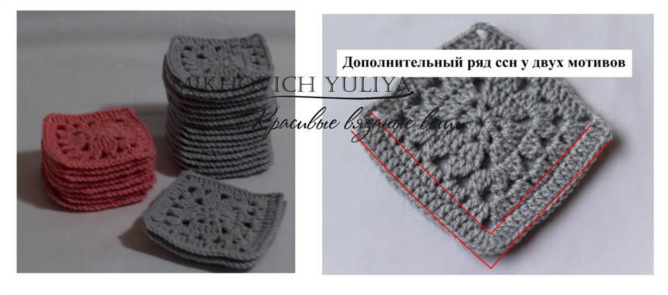 В данном мастер-классе связано 8 розовых и 18 серых мотивов. У двух серых квадратиков 2 стороны обвязать дополнительным рядом столбиков с накидами.