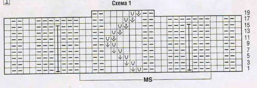 Узор из листьев и зигзагов следует вязать согласно схемы 1: