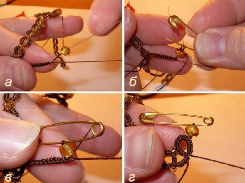 Концы нитей выложим с челночка между «лапками» готовой шпильки.