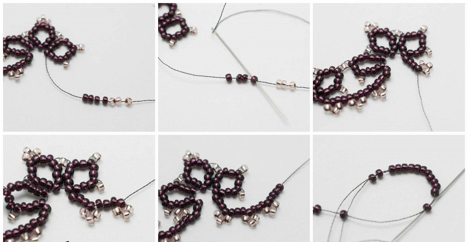 - Первый ряд включает пять колец и множество пико. Сплетя их, переверните изделие и начните новый ряд.