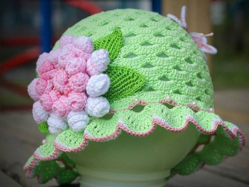 Те, у кого развита фантазия, могут придумать объемные композиции из лент и бусин, чтобы вязаная шапочка выглядела нарядно. Отлично будут смотреться стразы, если их пришить сверху, подобрав подходящие цвета. Выбор декора зависит от схемы, по которой были связаны ажурные шапочки крючком для девочек. Главное, не переборщить с украшением, чтобы головной убор не получился слишком вычурным.