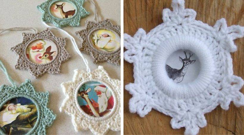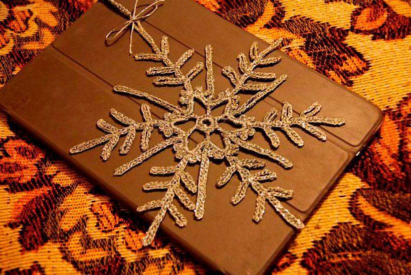 Так же можно поэкспериментировать со своей фантазией и придумать множество оригинальных игрушечек на елку. Например, можно связанную снежинку нашить на круг из фетра или растянуть снежинку на металлическое кольцо.
