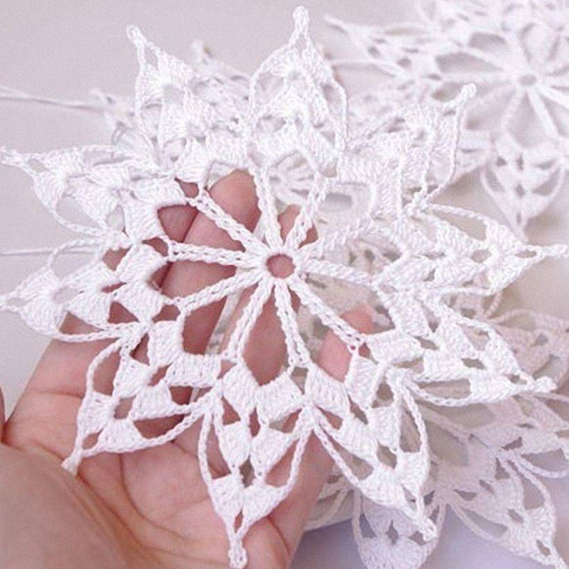 В процессе вязания этих снежинок вы поймете, что их нужно будет накрахмалить особенно тщательно, о том, как это сделать, мы обязательно расскажем позже. А что получится, если вязать по одной из этих минималистичных схем, вы можете посмотреть ниже.