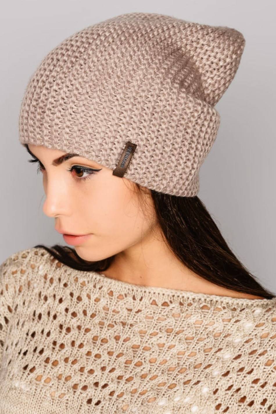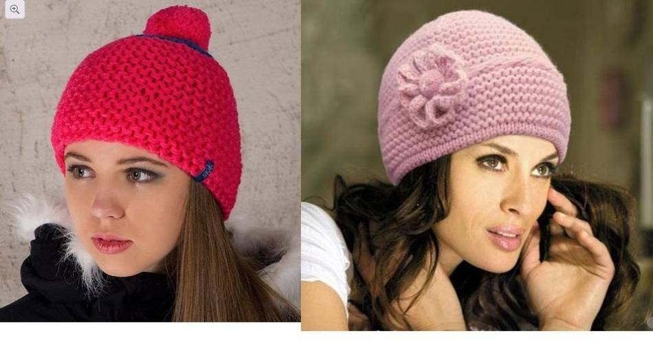 простая модель женской вязаной спицами платочным узором шапки на девушке