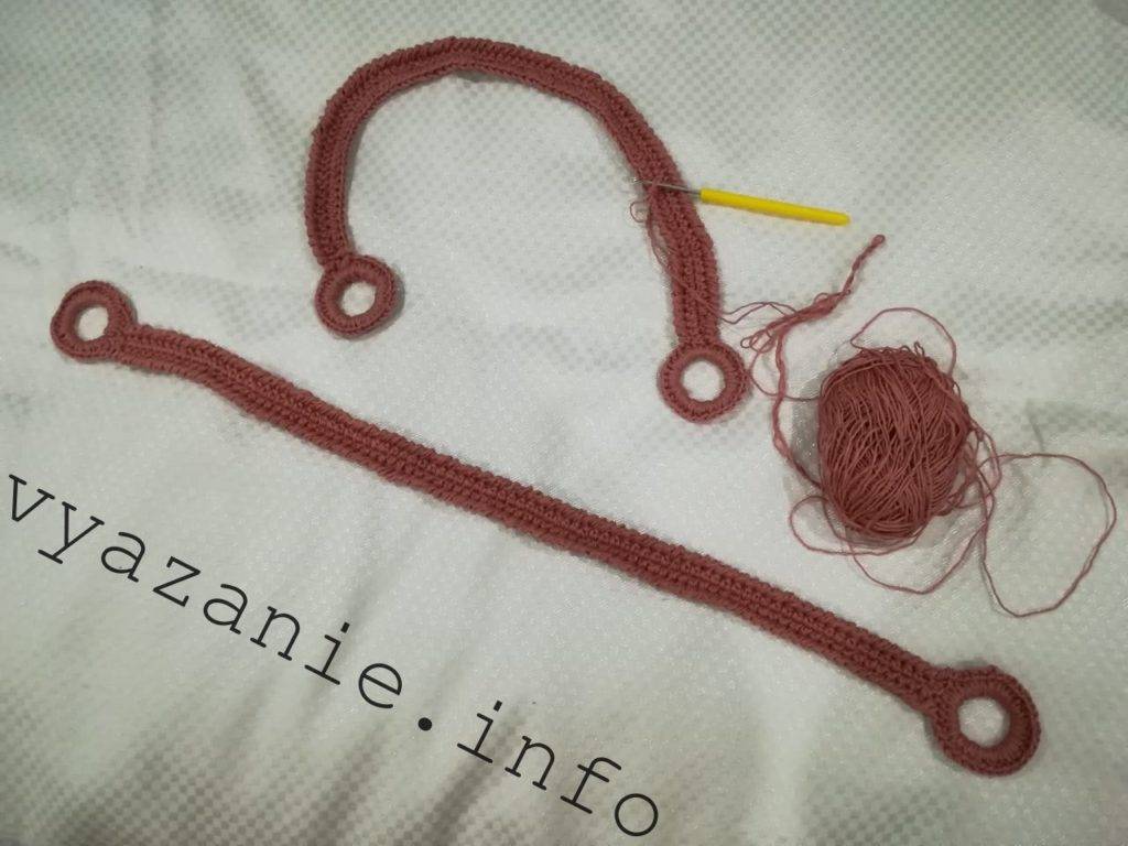 Дальше следуют ручки коричневого цвета – цепочка В.П. 102 сантиметра. Сделать здесь два ряда: первый – С.С., второй – «рачьим шагом».