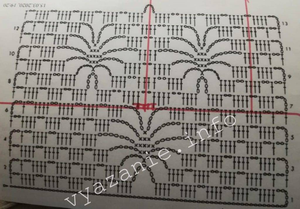 Две детали боковых частей сумки будем вязать узором из пышных столбцов по схеме на фото ниже:
