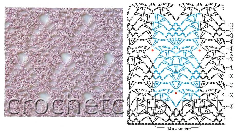 Вязание платка выполняем рядами, начиная от центра верхнего ряда. Работаем по приведенной схеме. Раппорт узора на ней выделен розовым цветом.