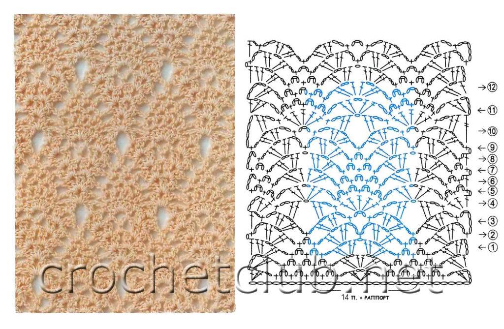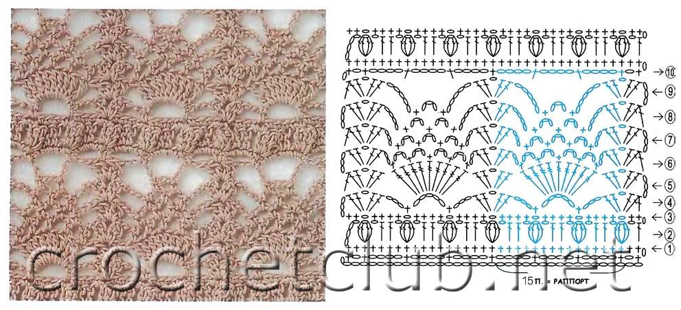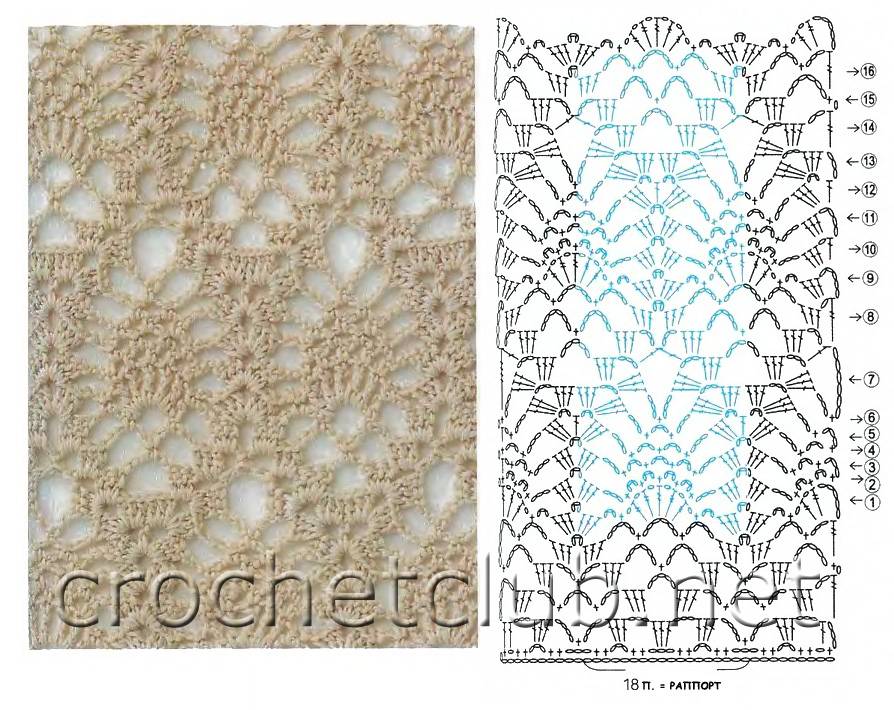 Вторая часть схемы. Вяжется так же, как первая схема, только каждый ряд начинать с третьей воздушной петли вместо первого столбика или с четвертой воздушной петли вместо первого столбика с 2/н.